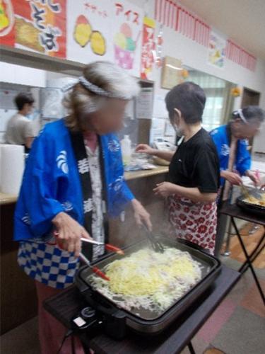 2Fでは、焼きそばをご利用者様と職員が作って、ノンアルコールビール(飲めるご利用者様のみ)で乾杯しました!こちらも盛大に盛り上がり、焼きそばを焼いてくださったご利用者様達は大忙しでした。